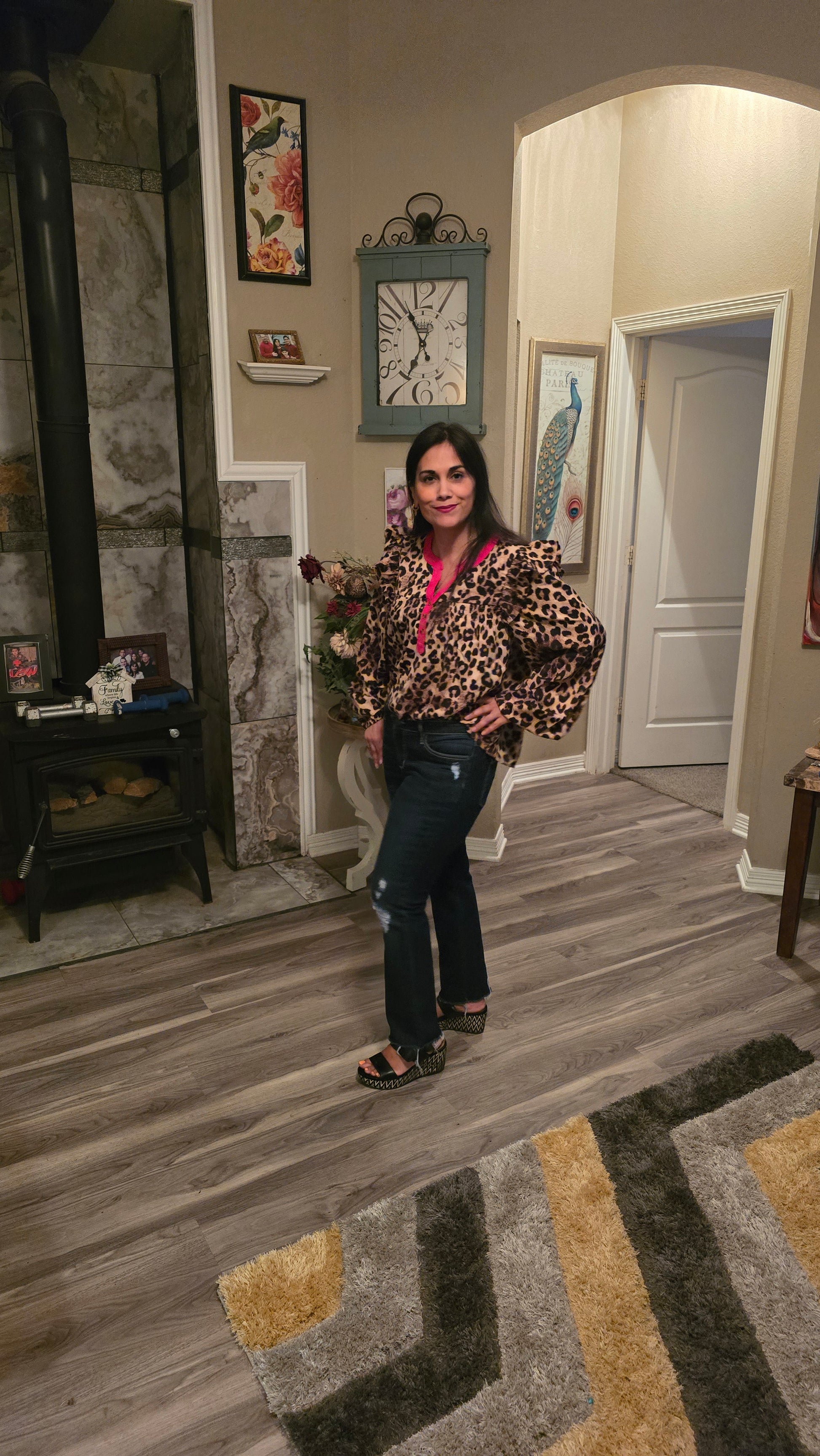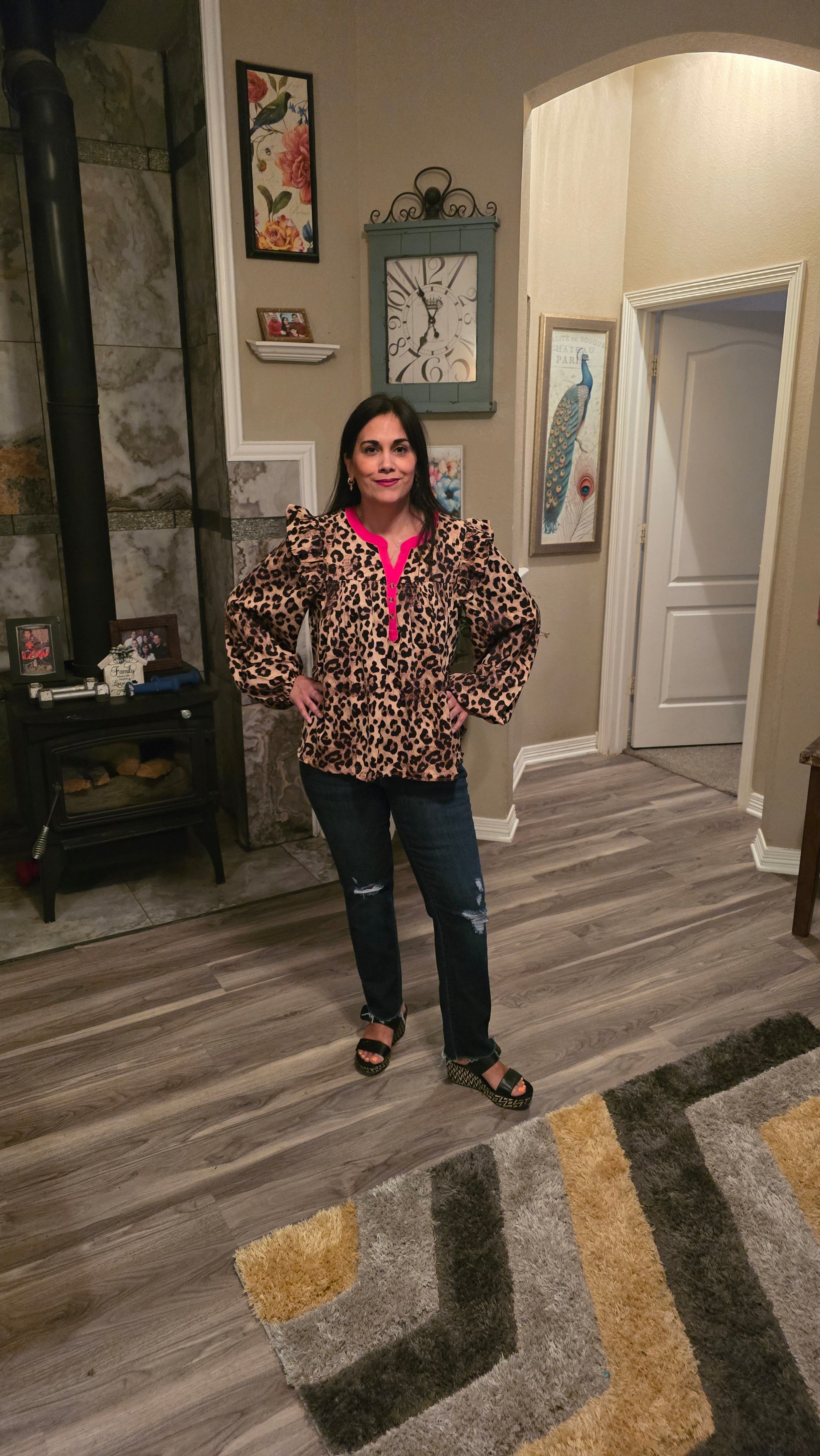 Leopard printed blouse with ruffled shoulders, smocked yoke, and a bold contrast red placket.